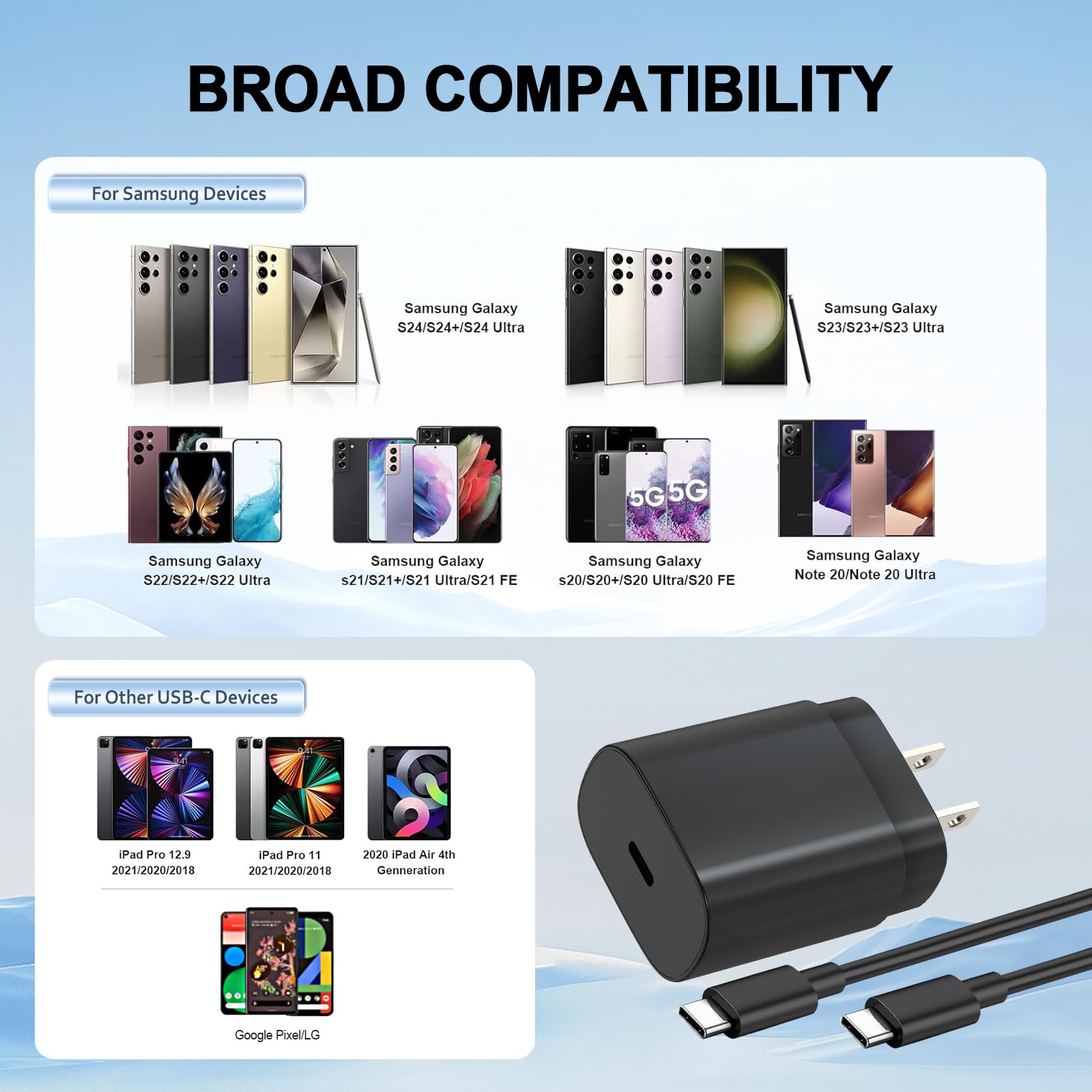 【Widely Compatible Type C Charger】Our usb c power adapter is widely compatible with Samsung Galaxy S24 Ultra/S24/S24+/ S23 Ultra/S23/S23+/S22/S22 Ultra/S22+/S21 Ultra/S20 Ultra/Note 20/Note 10/Z Fold 3, S9, S9+ Plus, S8, S8+ Plus / Active, A70, A80, S10, S10 plus, Google Pixel, Pixel 2, Pixel 3, Pixel XL, Pixel 2XL, Pixel 3XL, Pixel 4XL , Pixel 3A, LG G7 Thing, G8, G6, G5, Stylo 4, V20, V30, etc